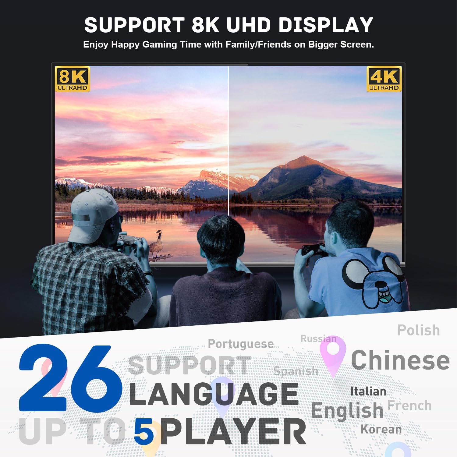 - 【8K UHD Output 】CUBE X3 video console supports 8K UHD output ,up to 5 players,26+ languages, you can enjoy your happy gaming time with family/friends or foreign friends on a bigger screen at any time. It's a nice Christmas gift.