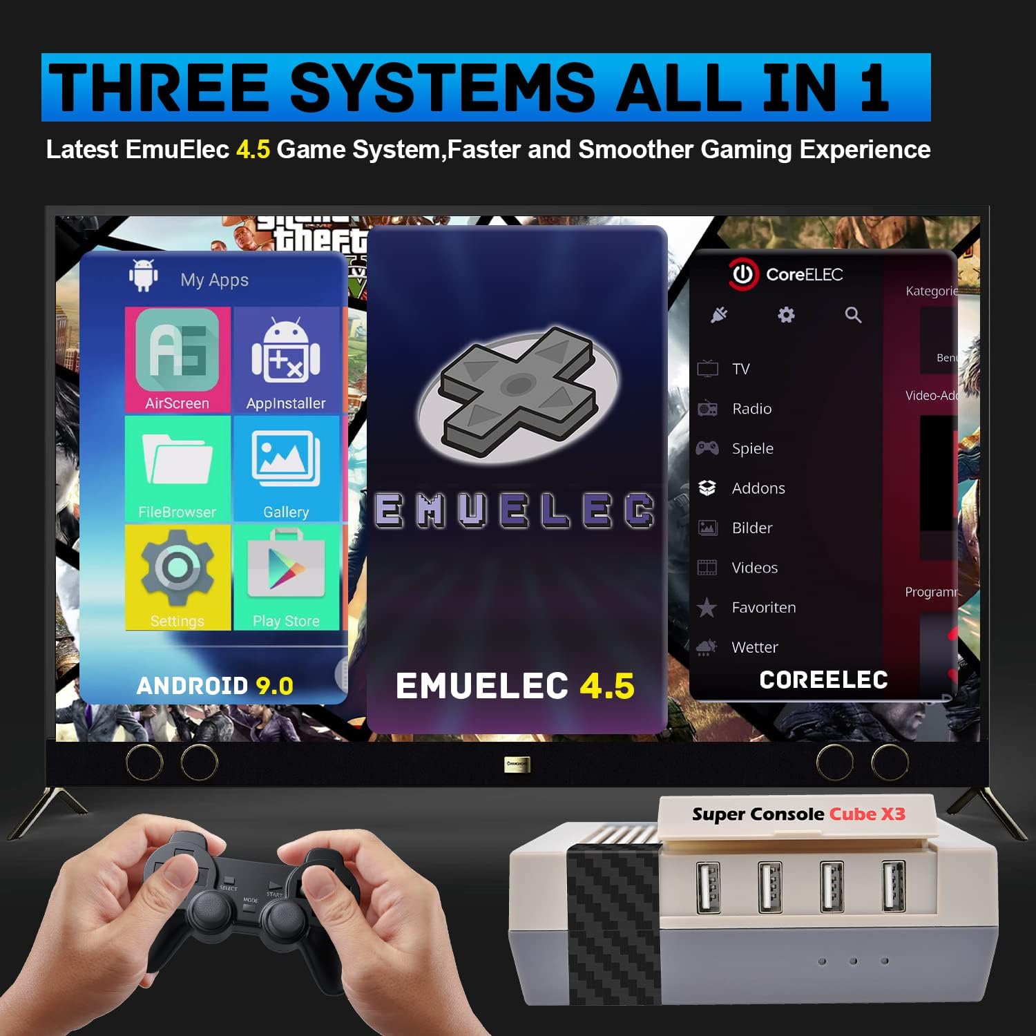 - 【3 Systems All in 1】Retro play CUBE X3 is equipped with latest EmuELEC 4.5 game system + Android TV 9.0 system + CoreE system, small but powerful, easy to switch among watching TV, playing games and surfing internet.