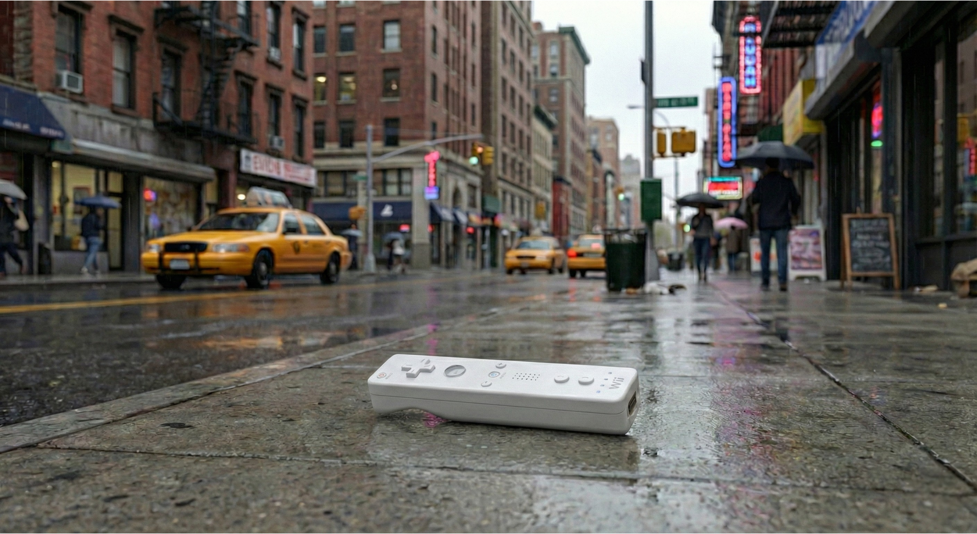 Capture moody urban nostalgia with this cinematic scene of a lone white Wii remote lying on a wet sidewalk in the middle of a rainy city block. Glowing shop signs, blurred yellow taxis, and pedestrians with umbrellas fade into the background, while reflections shimmer across the pavement around the forgotten controller.
